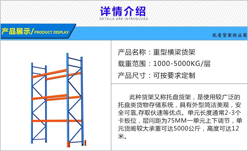 1、重型橫梁式貨架結構簡單、安全可靠,可任意調整組合;安裝、拆卸方便靈活。