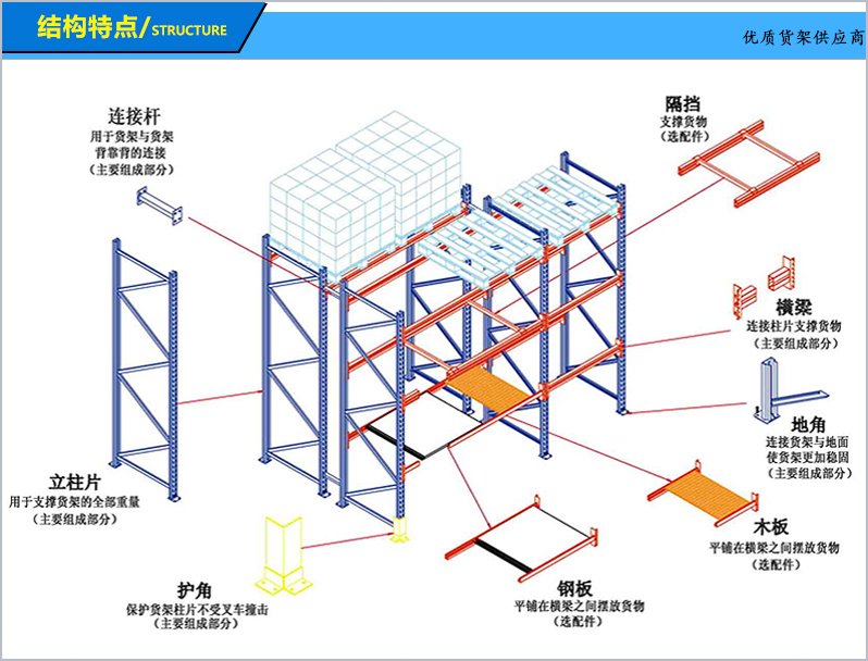 4、可以增加立柱護腳、防撞桿,防止叉車碰撞;為了層載更安全 還可在橫梁上安置橫梁擱擋、層板、網片跨梁等附屬設施。