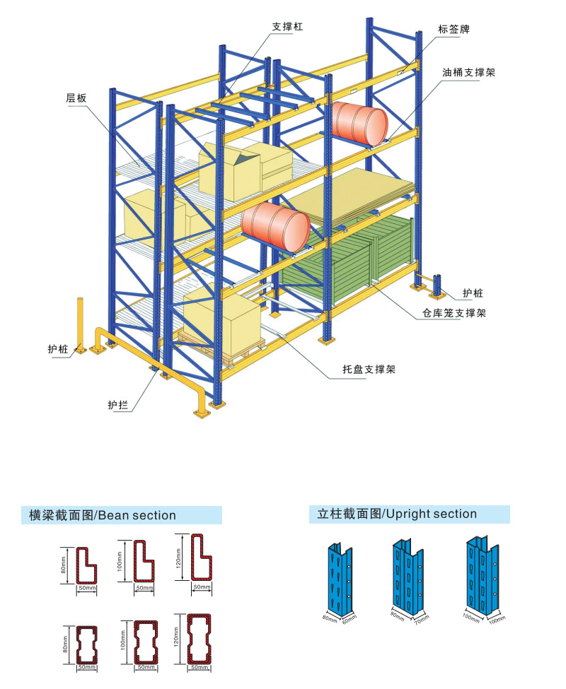 重型橫梁式貨架是目前使用應用廣泛的貨架類型之一,具有較強的通用性,可適應各種類型的貨物,可按貨物尺寸要求調解橫梁高度。重型橫梁式貨架主要由立柱、橫梁、橫撐、斜撐以及自鎖螺栓組裝而成。橫梁與立柱的連接多采用機械式的鎖扣結構,可隨意拆裝組合。橫梁采用特制的冷軋P型閉口梁;該結構具有簡單可靠、重量輕、承載力強、造價低的特點;柱卡與立柱連接時配有特殊設計安全銷,可以確保橫梁在外力撞擊下不會脫落。可根據存儲單元集裝設備的特性加裝如:隔檔、鋼層板(木層板)、金屬絲網層、倉儲籠導軌、油桶架等功能性附件。根據用戶實際使用情況:托盤載重要求、托盤尺寸、倉庫實際空間、叉車實際提升高度,可提供不同規格的橫梁式重型貨架以供客戶選擇。